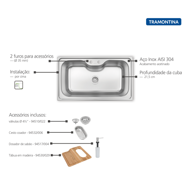 BACHA EMBUTIR TRAMONTINA LAVINIA SATINADO C/SOPAPA 40X34X17 CM